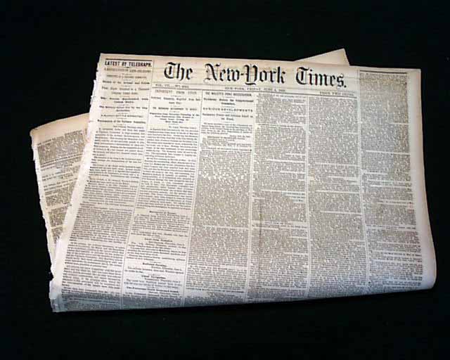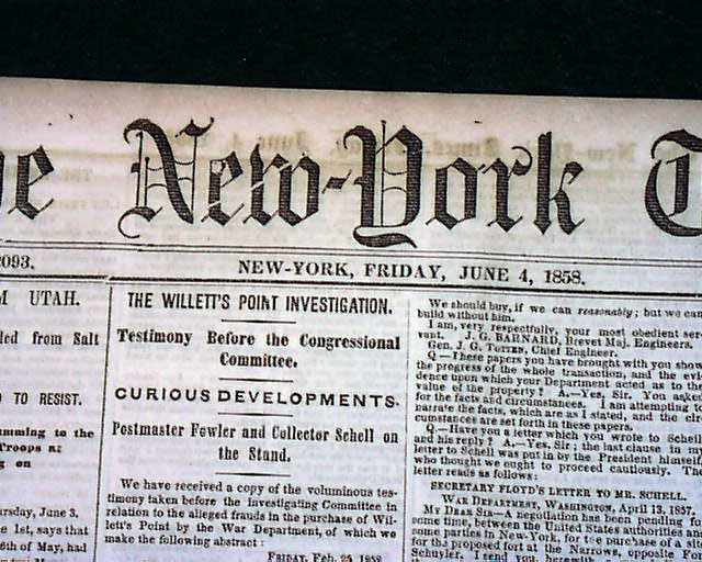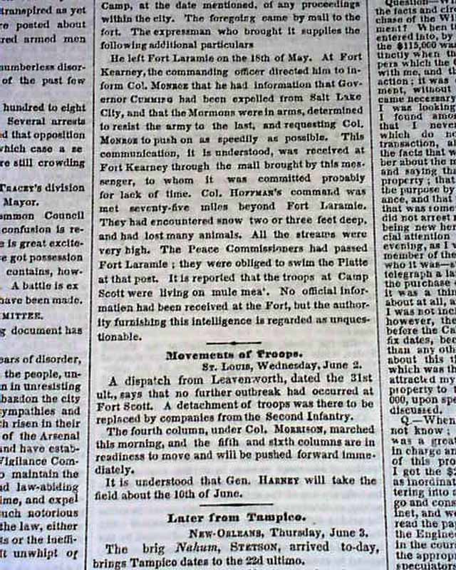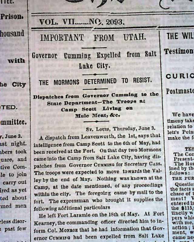 THE NEW YORK TIMES, June 4, 1858 The ftpg. has items concerning the Mormon troubles in Utah with heads: "Important From Utah" 'Governor Cumming Expelled from Salt Lake City" "The Mormons Determined To Resist" "Dispatches from Governor Cumming to the State Department--The Troops at Camp Scott Living on Mule Meat, etc." Other news of the day & a wealth of ads. Complete in 8 page, a bit irregular at the spine, very nice condition.