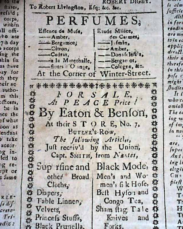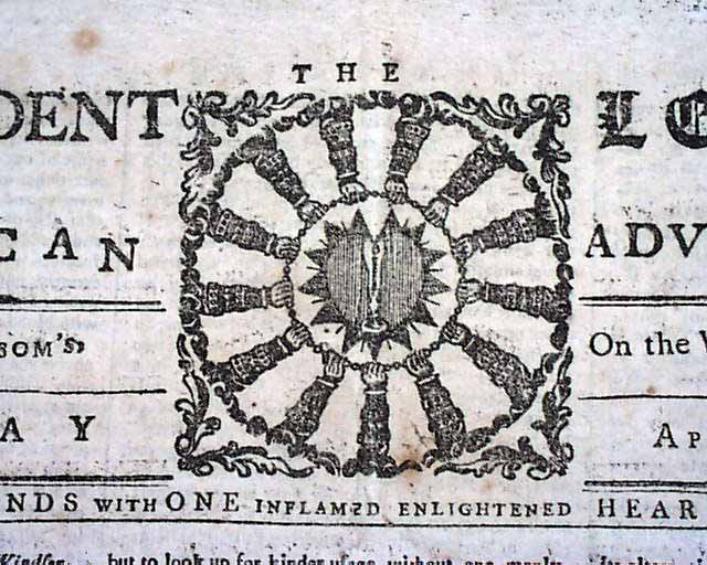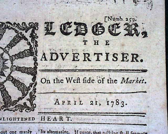 THE INDEPENDENT LEDGER & AMERICAN ADVERTISER, Boston, April 21, 1783  The masthead features a very nice, patriotic engraving which shows "All Hands With One Inflamed, Enlightened Heart", as is written below the engraving (see photo).