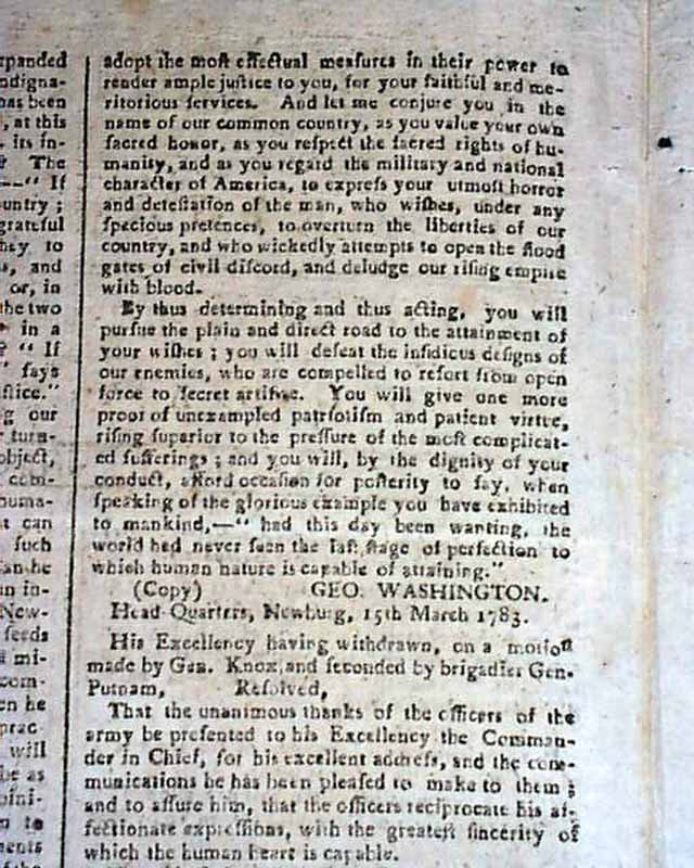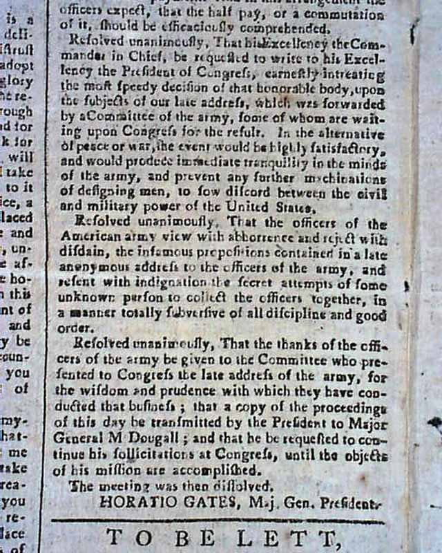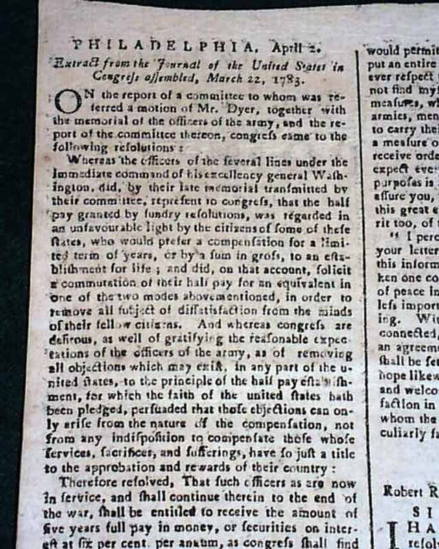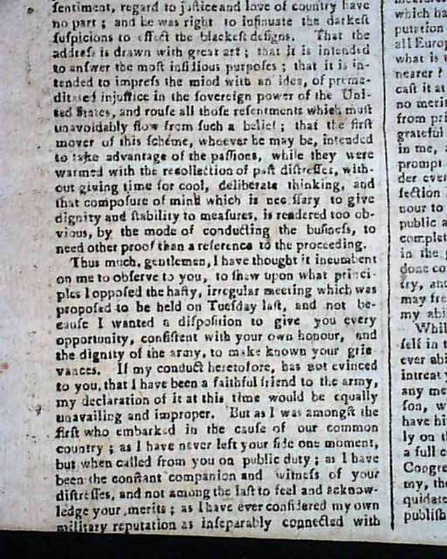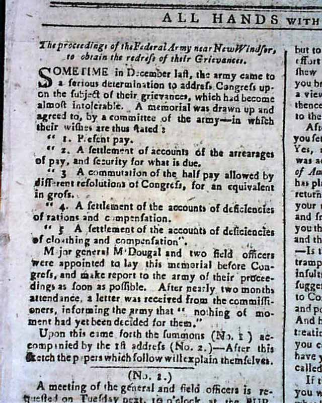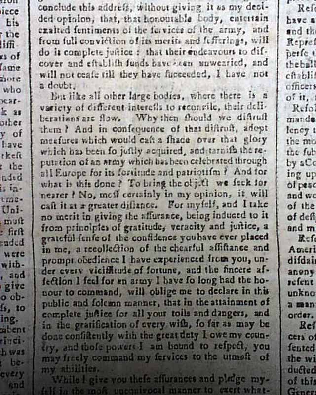 The entire front page contains the Addresses from the disgruntled Continental Officers over receiving but half pay and also pension promises for their service & sacrifices, with General Washington's lengthy  reply--in full--on page two and signed by him in type: Geo. Washington. In his letter Washington advises moderation and patience, and promises expeditious congressional action on the salary & pension demands of the soldiers. A week later Congress allots the officers a lump sum equalling five years' pay each, with this historic report found on the back page (see photos).