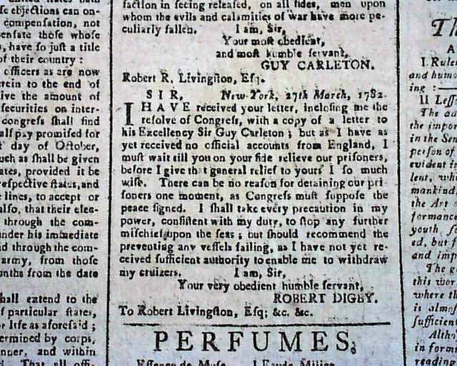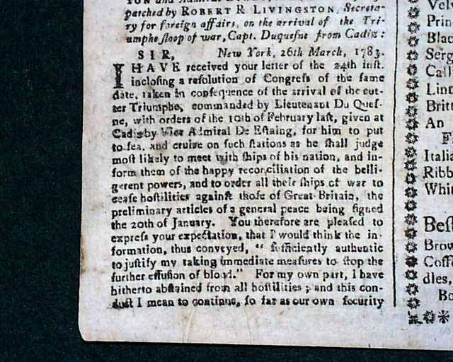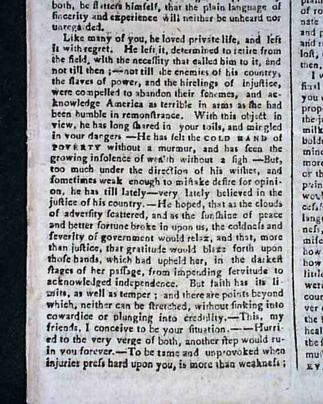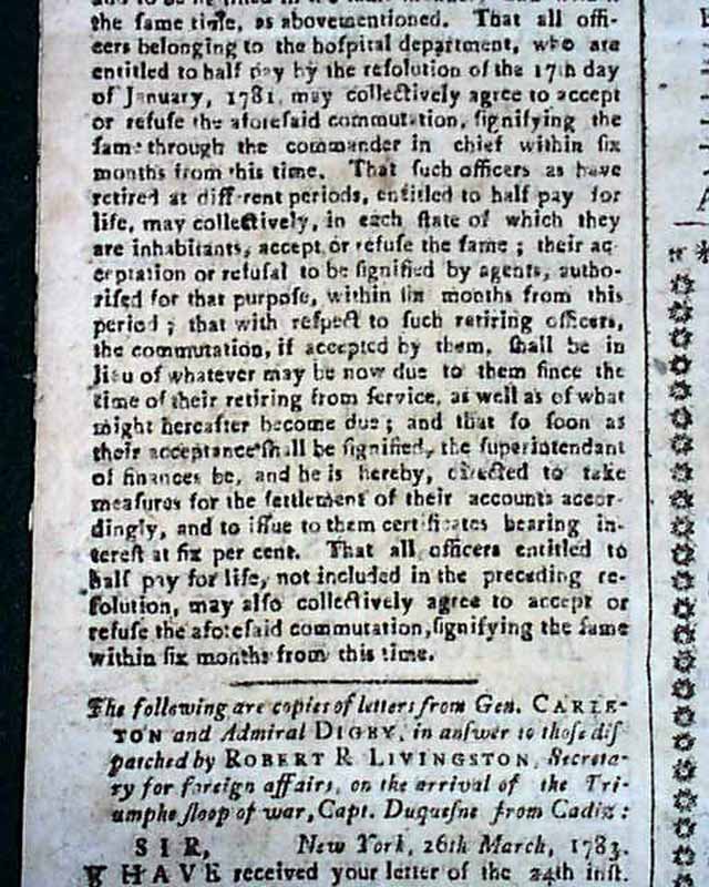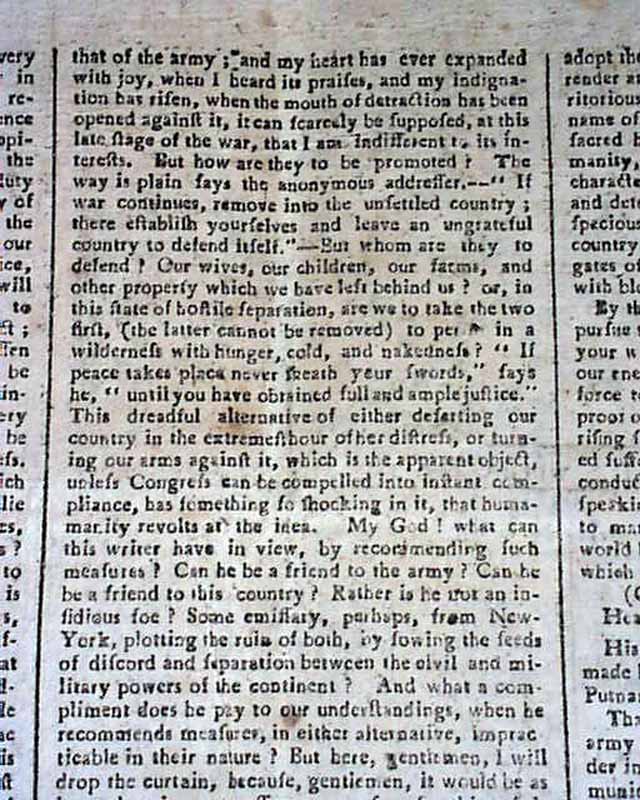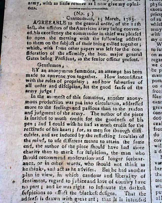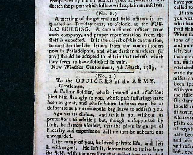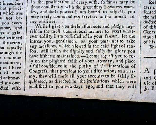 The entire front page contains the Addresses from the disgruntled Continental Officers over receiving but half pay and also pension promises for their service & sacrifices, with General Washington's lengthy  reply--in full--on page two and signed by him in type: Geo. Washington. In his letter Washington advises moderation and patience, and promises expeditious congressional action on the salary & pension demands of the soldiers. A week later Congress allots the officers a lump sum equalling five years' pay each, with this historic report found on the back page (see photos).