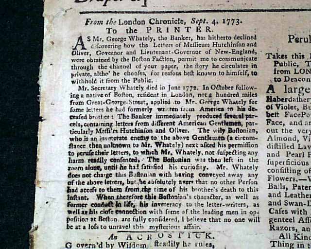 The front page also has an explanation how "...the letters of Messieurs Hutchinson & Oliver, Governor & Lt. Governor of New-England, were obtained by .the Boston faction...", which is followed by an interesting poem: "An Acrostick" based on the letters of Gov. Hutchinson.