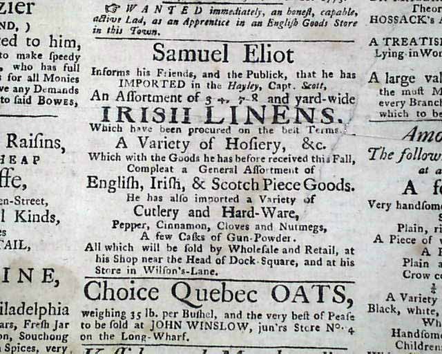 The front page has a report from the town meeting in nearby Marblehead concerning the British tea problem, reading in part: "1. Resolved as the opinion of this town, that Americans have a right to be as free as any inhabitants of the earth; and to enjoy at all times and uninterrupted possession of their property. 2. That a tax on Americans without their consent is a measure destructive of their freedom; reflecting the highest dishonor on their resolutions to support it; tending to impoverish all who submit to it; and enabling to dragoon and enslove all who receive it..." 5) That tea from Great Britian, subject to a duty, whether shipped by the East India Company or imported by persons here, shall not be landed in this town while we have the means of opposing it; and that on every attempt of this kind immediate notice shall be given to our brethren in the province... 6) And whereas the tea consignees at Boston, who persist in refusng to reship the Tea lately consigned them by the East India Company..." with more (see photos).