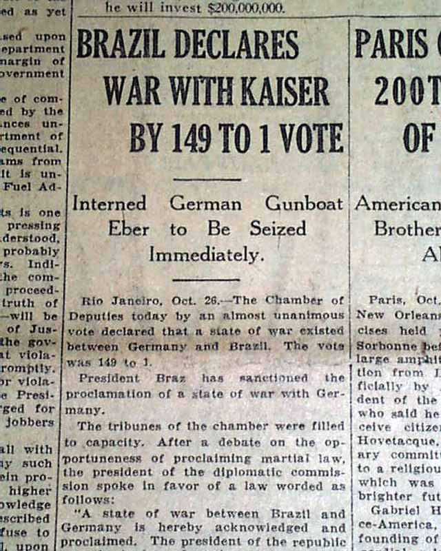 This 16 page newspaper has a three line, one column headline on the front page: "BRAZIL DECLARES WAR WITH KAISER BY 149 TO 1 VOTE" with subhead and other war related news. Other news of the day with advertisements. Piece missing to the bottom right corner of the front page with little margin wear, otherwise in good condition.