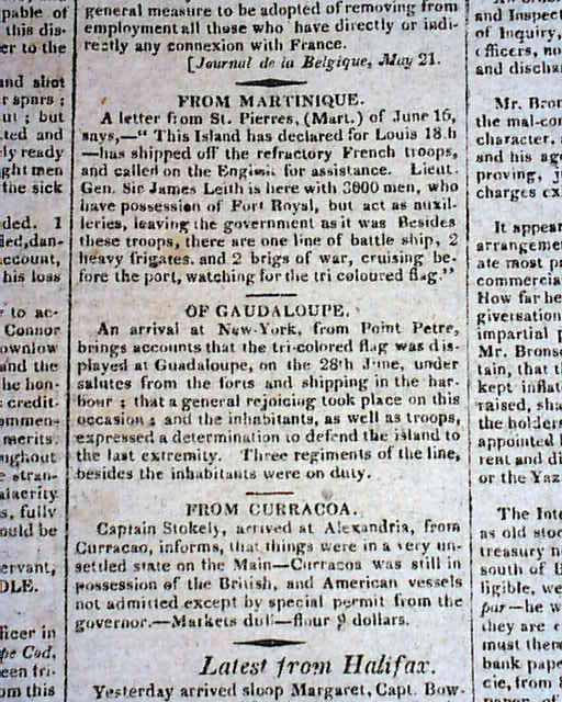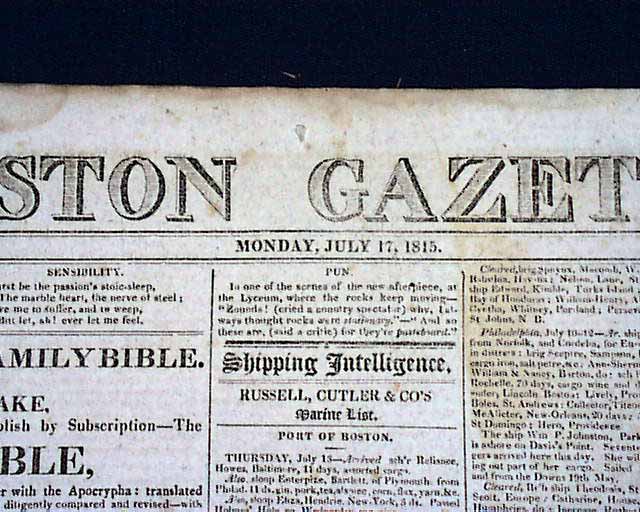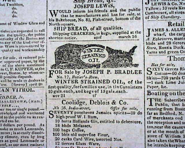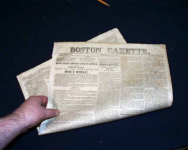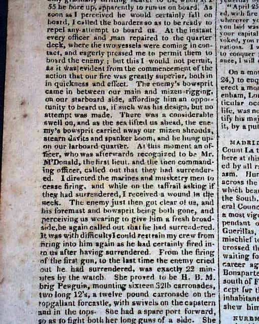 Page 2 has the "Official Account Of The Capture Of The Penguin" "Copy Of A Letter From Capt. Biddle To Com. Decatur", signed in type: J. Biddle. Other news of the day includes: "Important From Fishermen" "Port Of Boston" "Military Celebration" and more. Many interesting advertisements as well. Has a small hole above the masthead, some lite foxing, mostly on the front page, otherwise in nice condition.