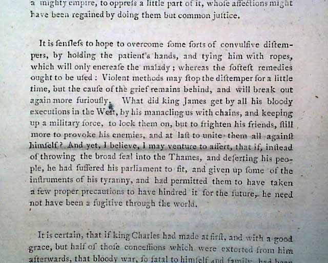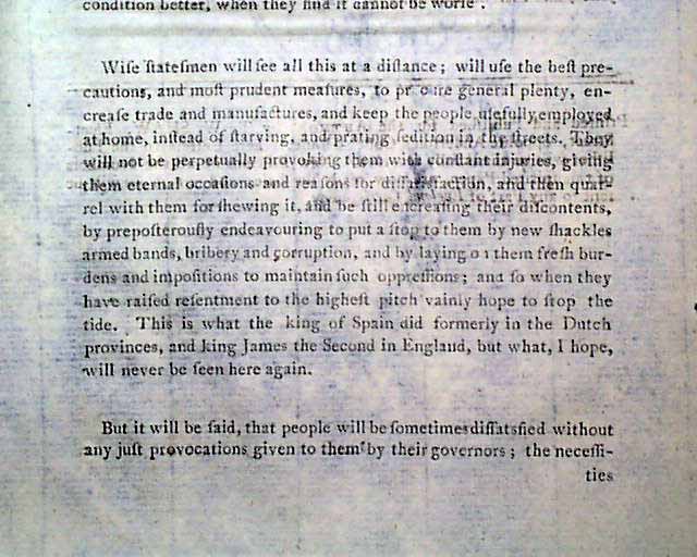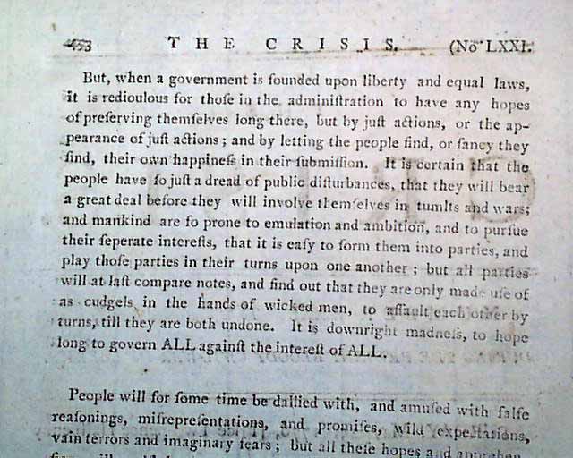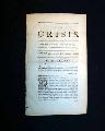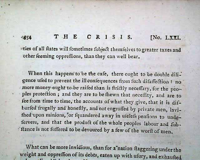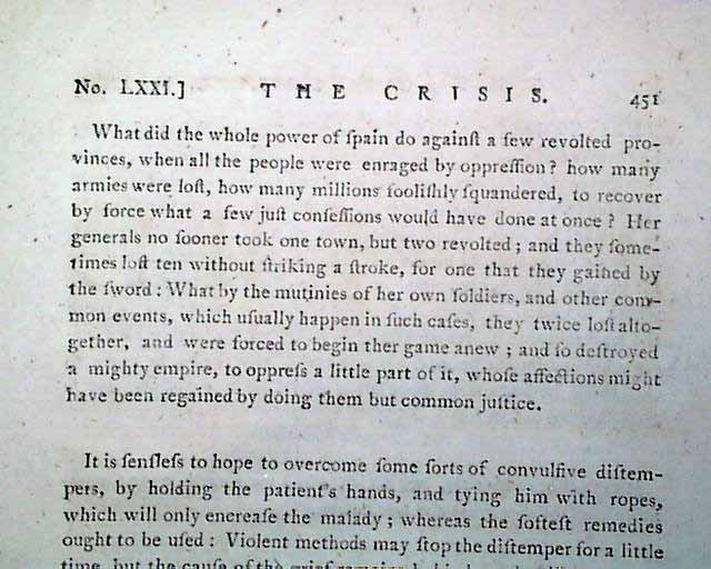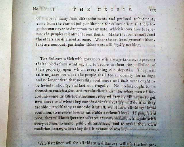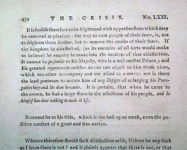THE CRISIS, London, May 25, 1776 In my over 30 years of dealing in rare newspapers I have only once had the great fortune to encounter issues of this very rare title. This extraordinary paper (see the photos below) is one of the most bitter political sheets to be found, issued in London both in defense of American liberty and their cause for independence, as well as to attack the policies of the King of England. One scholar noted: "This title, which is of great rarity, contains a remarkable collection of papers attacking the Ministry & the British Government in terms of the greatest severity. Indeed, one can hardly believe that in time of war a publication of such character would be tolerated." The editors certainly did not lack courage. The third number was ordered to be burned but their attacks, centering on the King and the American situation, only grew bolder & stronger, and continued throughout the duration of the war.