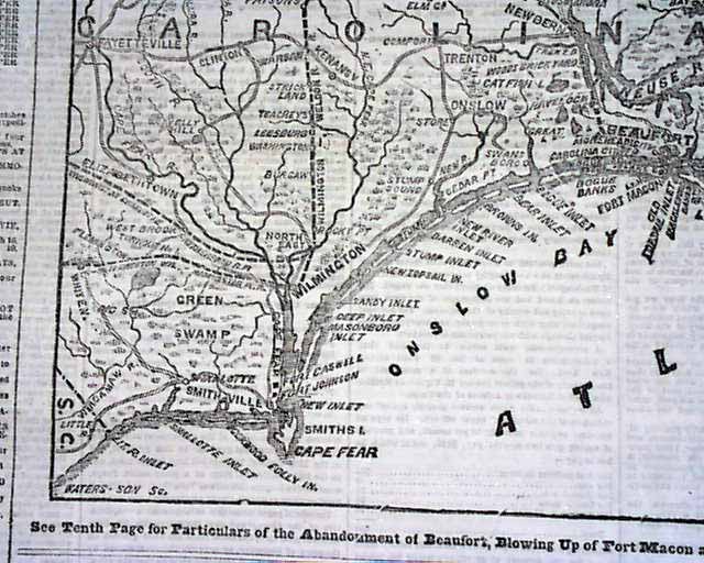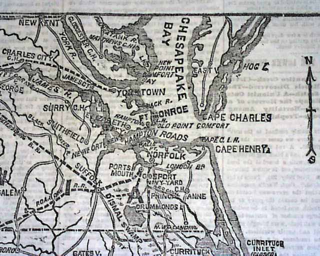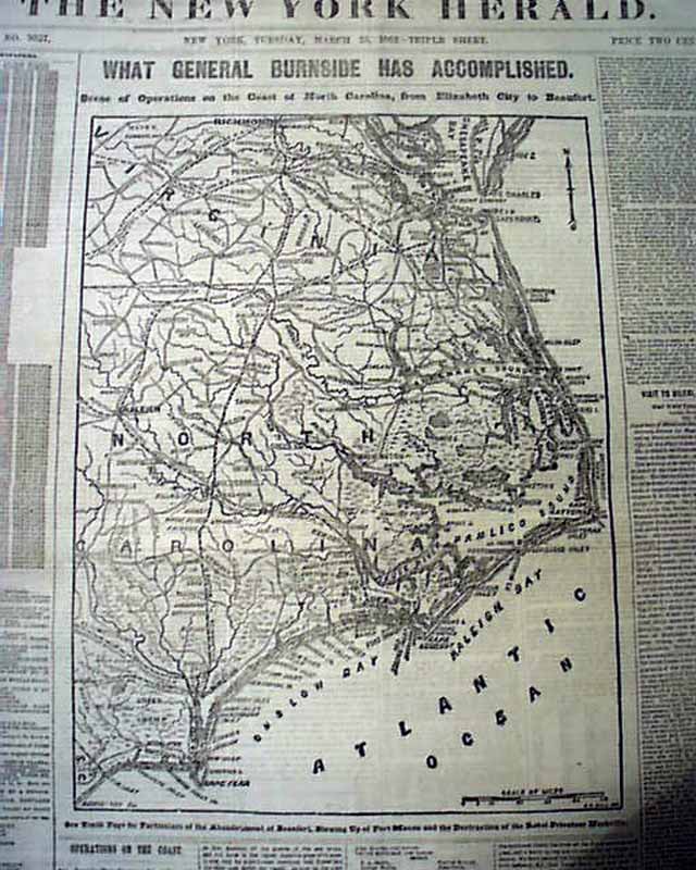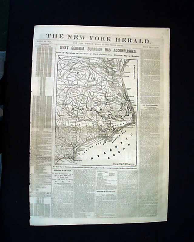 Is in nice condition (except for close cut at the spine) due to the use of cotton and rag paper during this very historic time in U.S. history. This issue is loaded with advertisements and Civil War reports throughout from the day it was first reported which includes the following FRONT PAGE Map: "WHAT GENERAL BURNSIDE HAS ACCOMPLISHED, Scene of Operations on the Coast of North Carolina, from Elizabeth City to Beaufort" Also another map on page three: "THE BATTLE IN THE VIRGINIA VALLEY." Headlines in this issue includes: "Operations On The Coast" "What The Navy Is Doing" "The Battle In The Virginia Valley" "The Rebels Driven Back To Strasburg" and much more. Also a uncommon theatre ad on the back page for: "Crowded Houses" which stars John Wilkes Booth. Nice to read about the Civil War as it was happening.