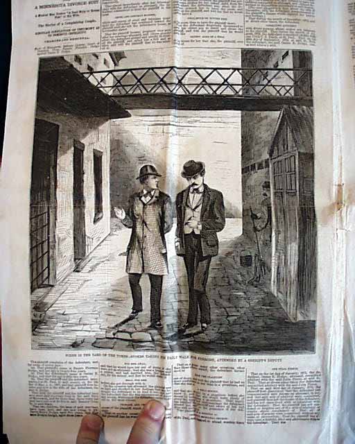 The full ftpg. shows: "Julie De Mondautour, of the Eyes Of Fire", with prints inside showing: "Scene in the Yard of the Tombs--Stokes taking his daily walk for exercise, attended by a Sheriff's Deputy.", "Ossian E. Dodge, Defendant in the famous Dodge Divorce Suit." and "A queer case of Conscience in Scotland" & the bkpg. showing: "Fannie E. Dodge, the Plaintiff in the famous Dodge Divorce Suit."