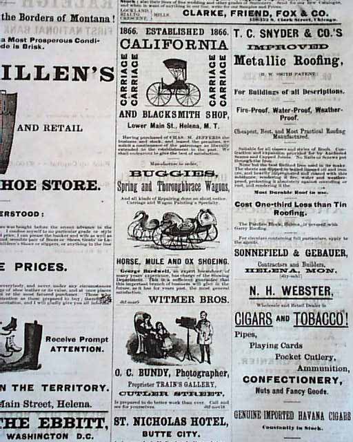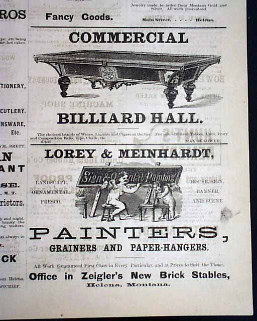 This 4 page newspaper has news of the day with several interesting advertisements. With newspapers West of the Mississippi being very rare prior to 1900, here is an opportunity to get a issue from the old West back when cowboys, indians, saloons, gold miners & gunfights were often seen on a regular basis. Very early for Montana. Good condition except for minor margin wear.