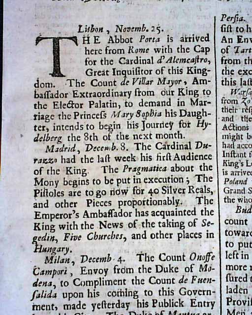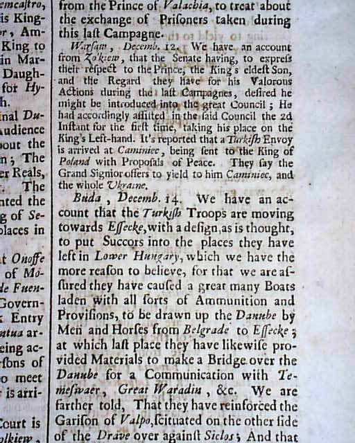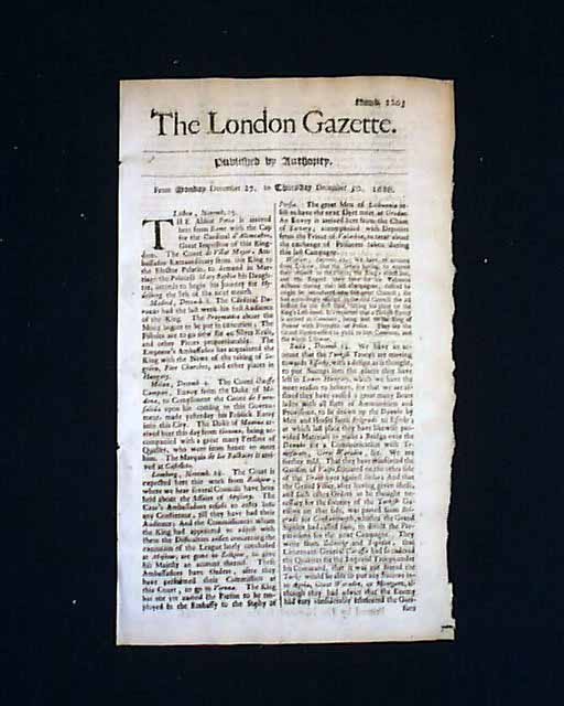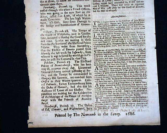 Here is the complete, genuine issue of THE LONDON GAZETTE dated December 30, 1686. This SINGLESHEET issue is 320 years old. Various news from London and other parts of Europe also with some interesting advertisements as well. A complete newspaper measuring about 7 by 11 1/2 inches and is in great condition. Made of rag paper which was used back in the day (no wood pulp). Fine and very early newspaper. Can easily be framed. WOULD MAKE A GREAT UNIQUE GIFT.
