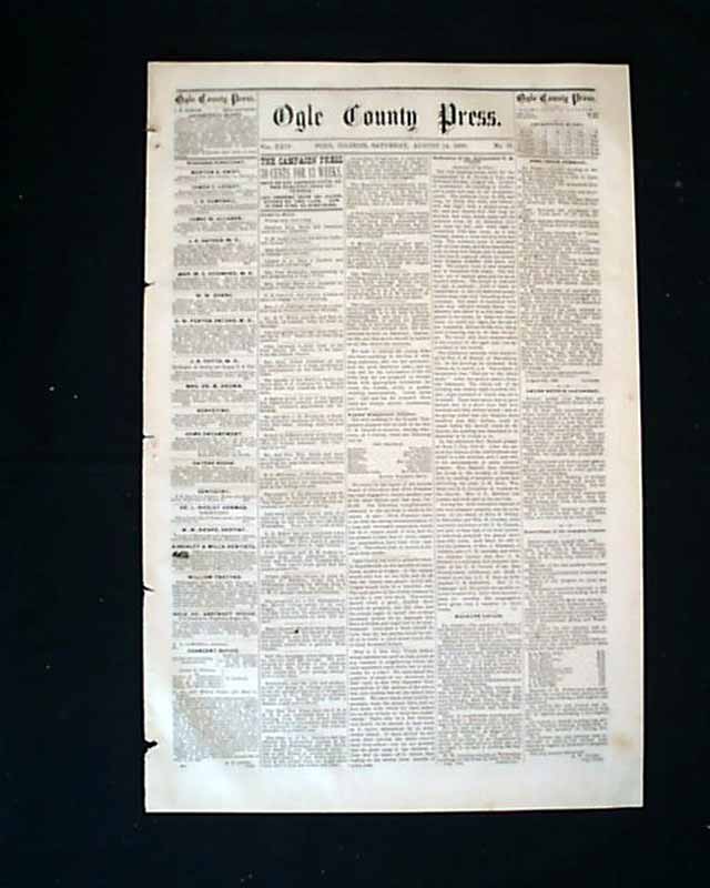 This 8 page newspaper is in good condition due to the use of cotton and rag paper during this time in history. This issue has news of the day and much more. Several interesting advertisements as well which gives a good idea how life was back then. A nice issue from early in the midwest. Nice condition.