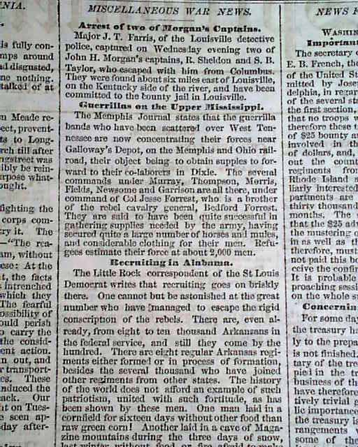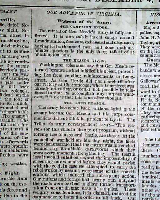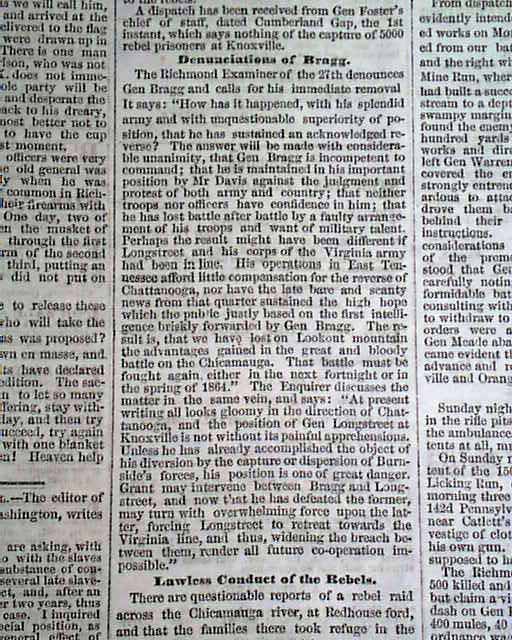 This 8 page newspaper is in nice condition due to the use of cotton and rag paper during this very historic time in U.S. history. This issue is loaded with advertisements and Civil War reports throughout from the day it was first reported which includes reports on: Knoxville TN - General Wilcox - General Longstreet - Braxton Bragg - General Meade - John Morgan - Alabama - Arkansas and much more. Would make a great, unique gift.