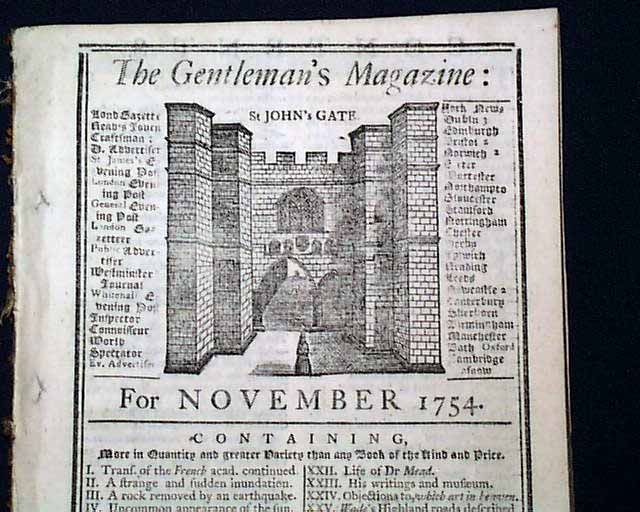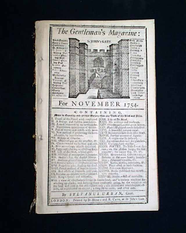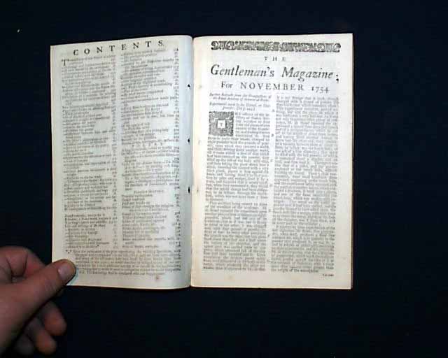 Here is a complete, genuine issue of THE GENTLEMAN'S MAGAZINE from London England. This magazine is dated: November, 1754 and is about 55 pages in length.