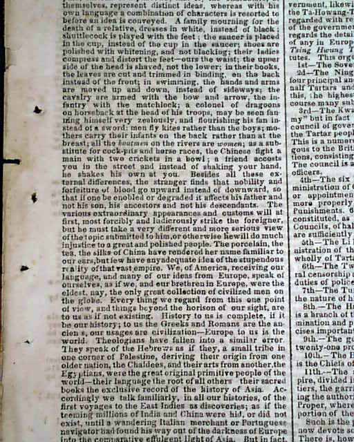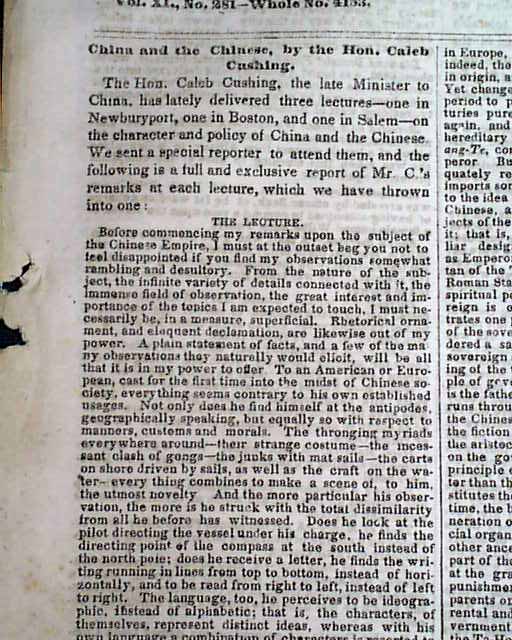 A full and exclusive report of the three lectures about the ...character and policy of China and the Chinese... delivered by Cushing, the former Minister to China. Takes 3 1/3 columns.