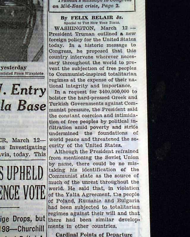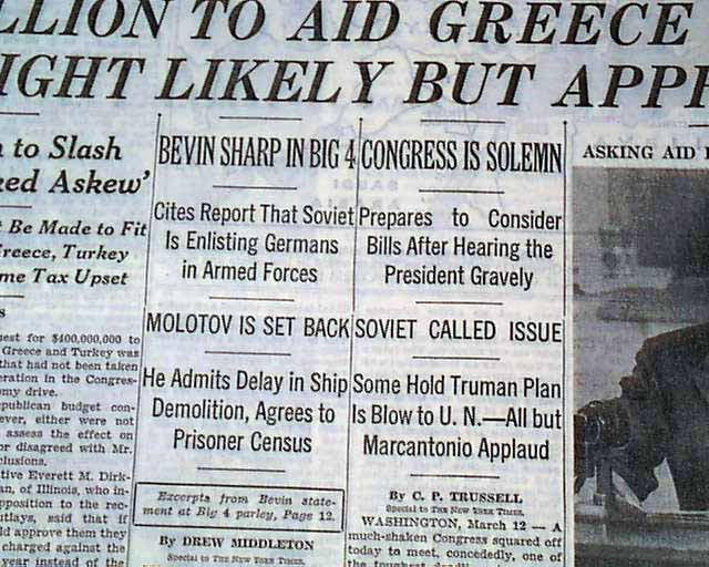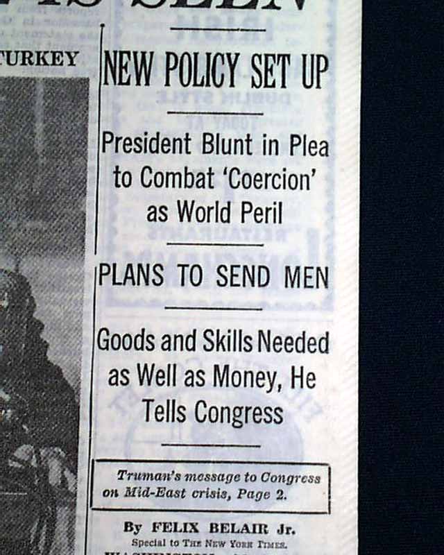 This 56 page newspaper has a three line banner headline on the front page: "TRUMAN ACTS TO SAVE NATIONS FROM RED RULE; ASKS 400 MILLION TO AID GREECE AND TURKEY; CONGRESS FIGHT LIKELY BUT APPROVAL IS SEEN" with many subheads and related photo. More on the inside pages.