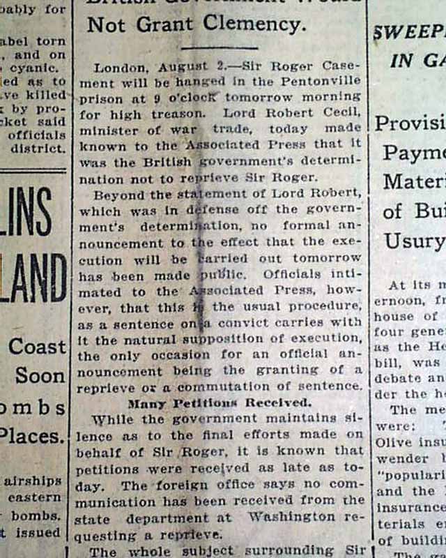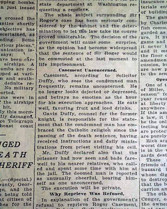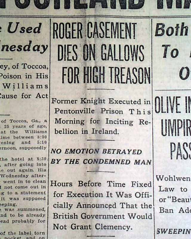 This 14 page newspaper has a three line, one column headline on the front page: "ROGER CASEMENT DIES ON GALLOWS FOR HIGH TREASON" with subheads that include: "Former Knight Executed in Pentonville Prison This Morning for Inciting Rebellion in Ireland" and more.