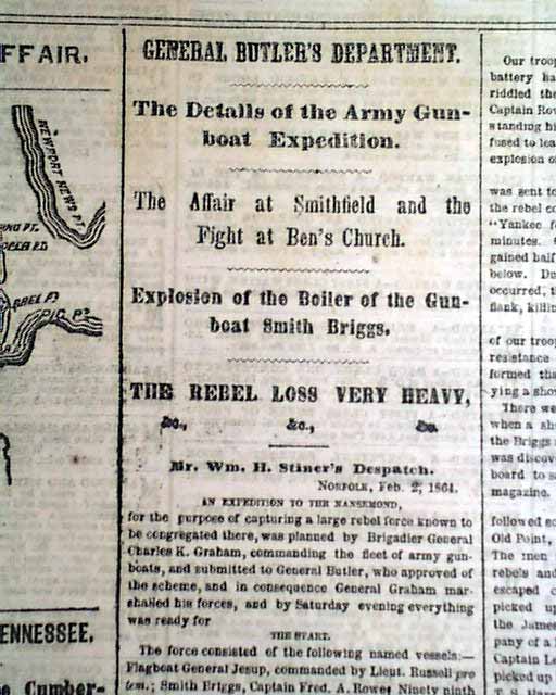 This 8 page newspaper is in good condition (except for a little margin wear, mainly the spine) due to the use of cotton and rag paper during this very historic time in U.S. history. This issue is loaded with advertisements and Civil War reports throughout from the day it was first reported which includes the following FRONT PAGE Map: