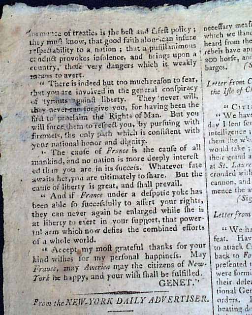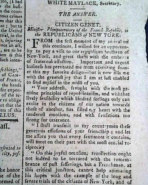 The front page has the Address presented to Citizen Genet upon his arrival at New York, followed by his answer to the Republicans of New York, signed in type on page 2: Genet.