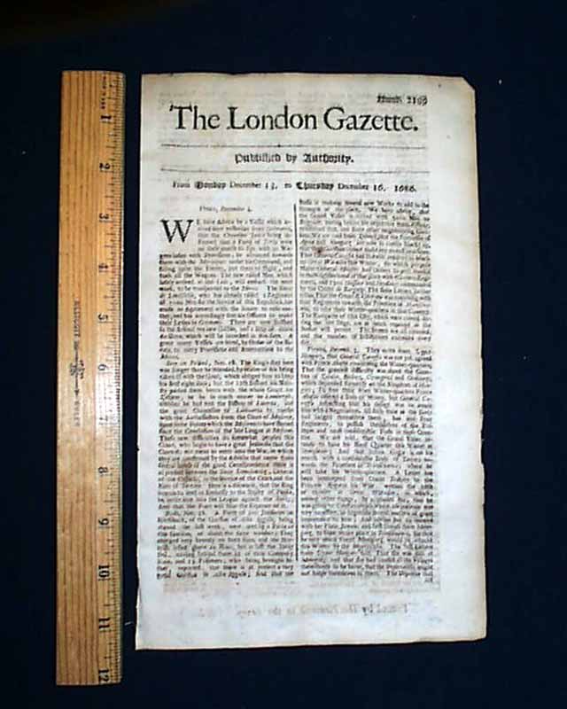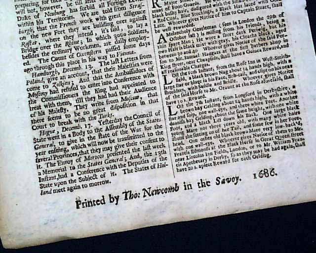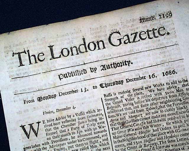 Here is the complete, genuine issue of THE LONDON GAZETTE dated December 16, 1686.