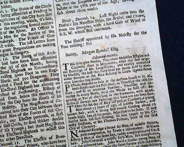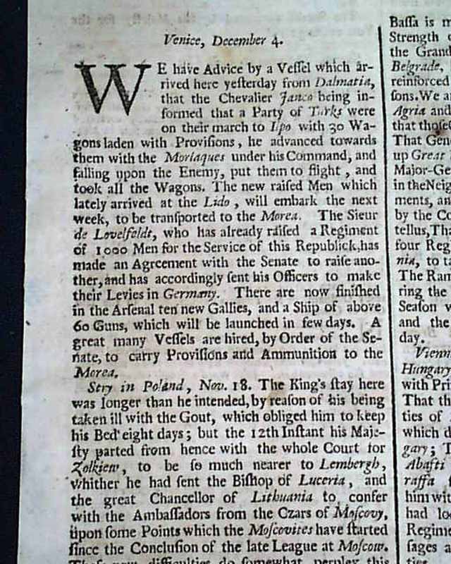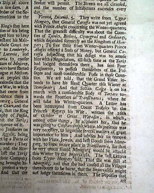 This SINGLESHEET issue is 321 years old. Various news from London and other parts of Europe also with some interesting advertisements as well. A complete newspaper measuring about 7 by 11 1/2 inches and is in great condition. Made of rag paper which was used back in the day (no wood pulp).