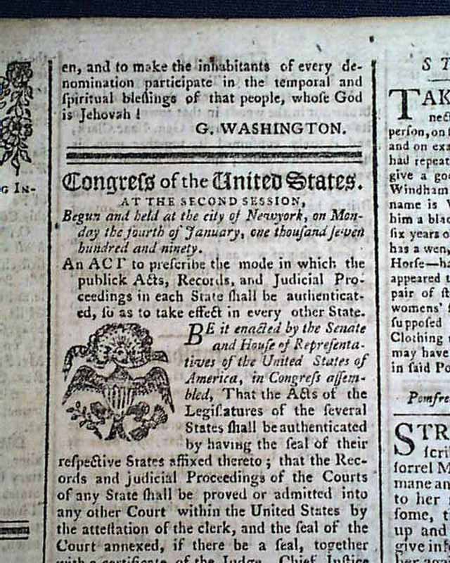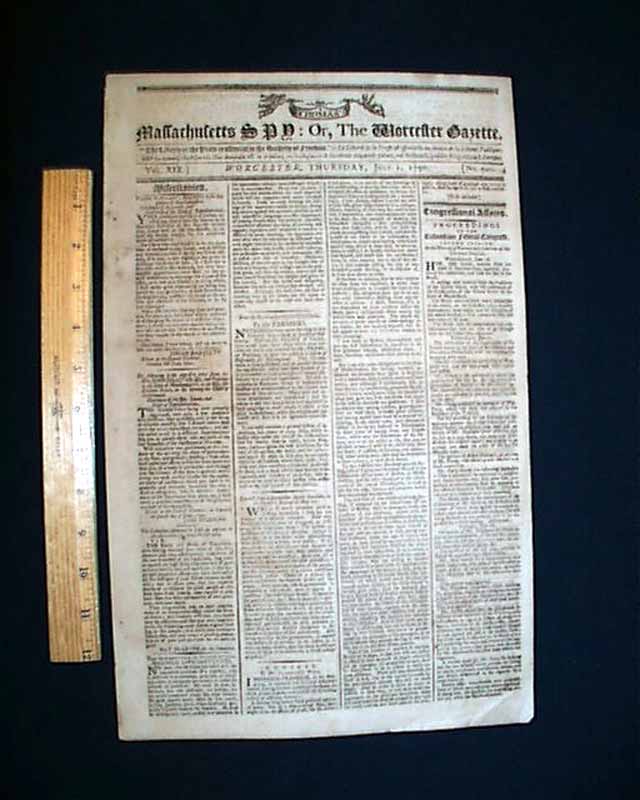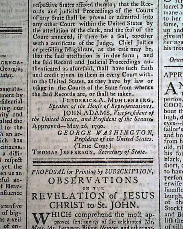 The balance of this issue has some fine content as well, including a back page Act of Congress which is signed in italic type by: George Washington, and in block type by John Adams and Thomas Jefferson (see).