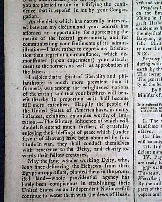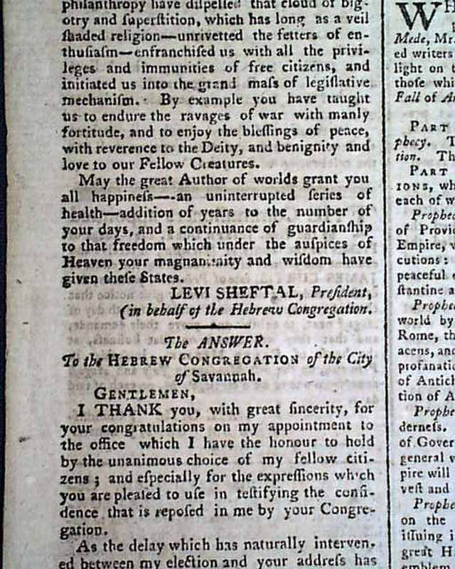 MASSACHUSETTS SPY OR THE WORCESTER GAZETTE, Worcester, Massachusetts, July 1, 1790 This is a very significant newspaper. The first column on the back page (page 4) contains the: "Address from the Hebrew Congregation of the city of Savannah, in Georgia, to the President of the United States" signed in type by: Levi Sheftal, President, in behalf of the Hebrew Congregation. This was a congratulatory letter on Washington assuming the Presidency.