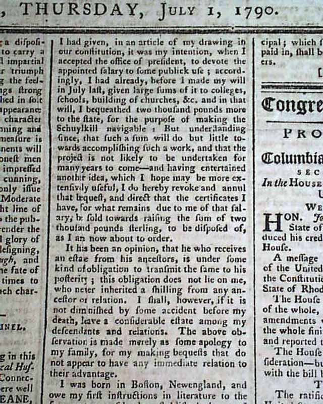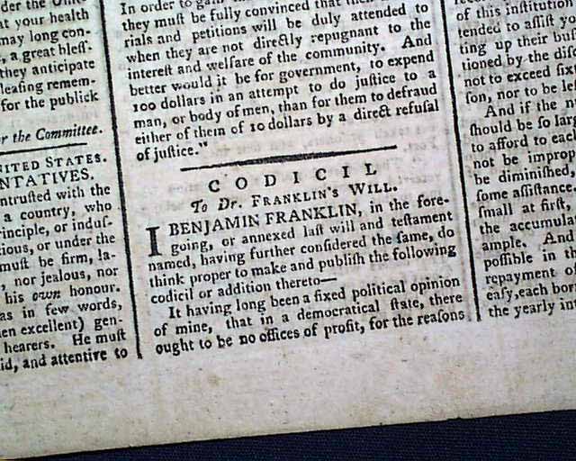 The front page contains the: "Codicil to Dr. Franklin's Will" which takes over a full column & is concluded in a future issue.
