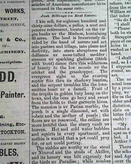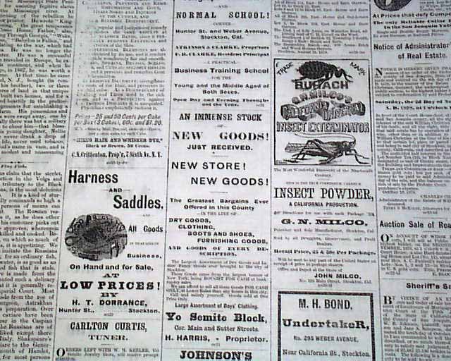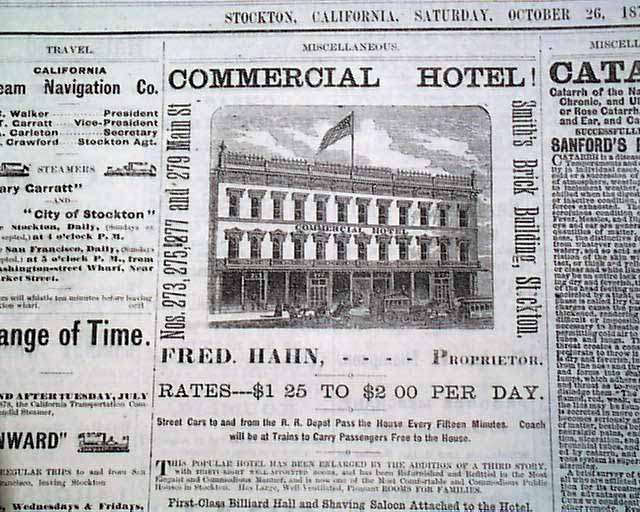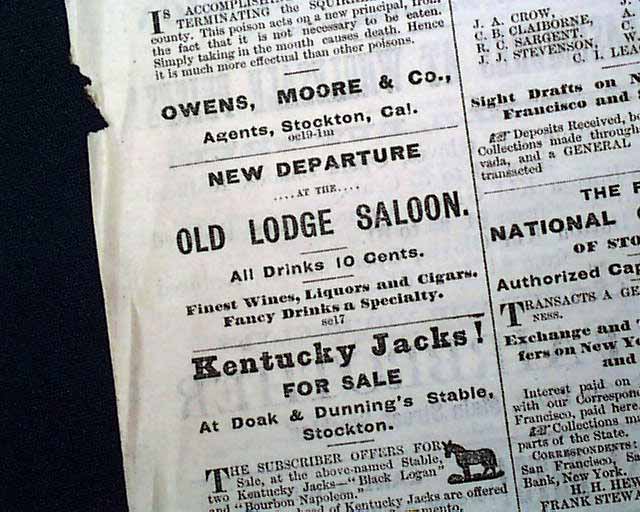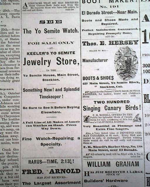 This 4 page newspaper has news of the day with several interesting advertisements. With newspapers West of the Mississippi being very rare prior to 1900, here is an opportunity to get a issue from the old West back when cowboys, Indians, saloons, gold miners & gunfights were often seen on a regular basis. Very early for California. Nice condition.
