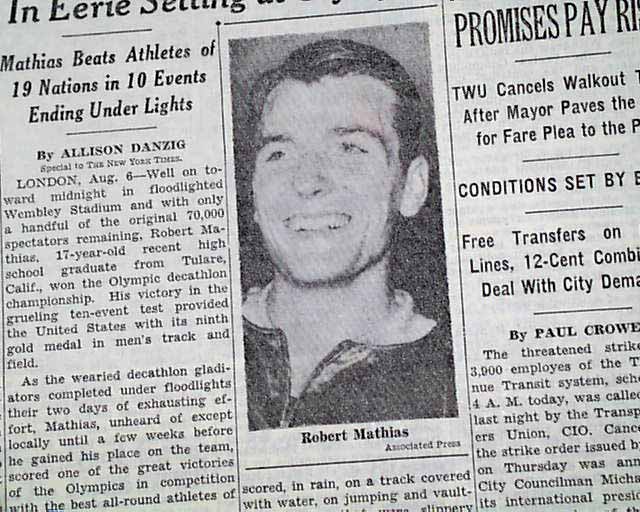 source: wikipedia: Bob Mathias was born in Tulare, California and took up the decathlon at the suggestion of his coach, Virgil Jackson, at Tulare High School early in 1948. During the summer, he qualified for the United States Olympic team for the 1948 Summer Olympics held in London.