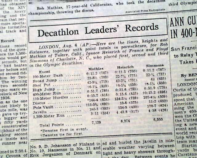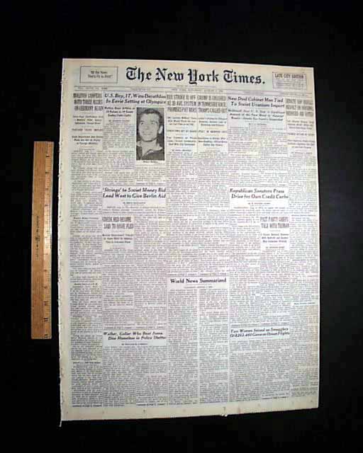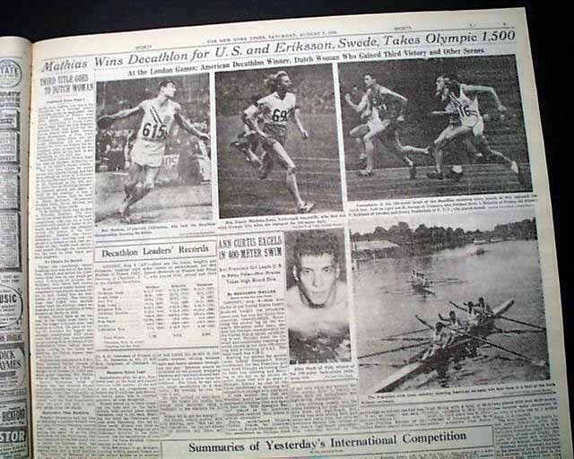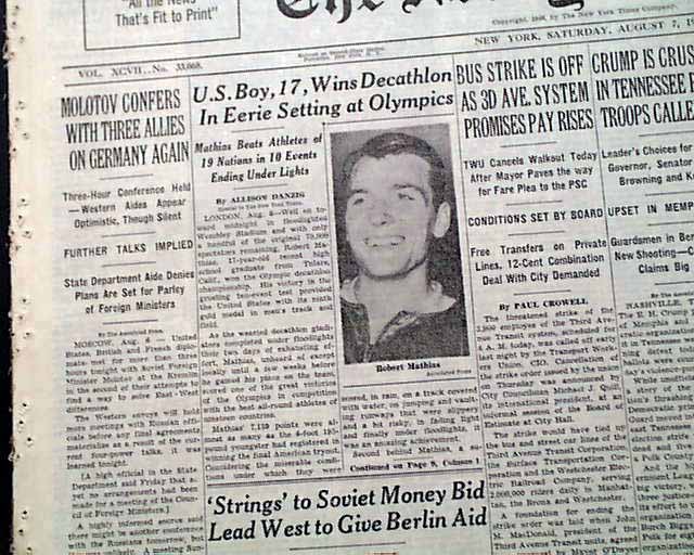 This 28 page newspaper has a two line, two column headline on the front page: "U.S. Boy, 17, Wins Decathlon In Eerie Setting at Olympics," with subhead: "Mathias Beats Athletes of 19 Nations in 10 Events Ending Under Lights," and a one column photo of Robert Mathias also on the front page.