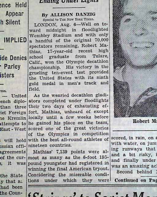 In the Olympics, Mathias' naïveté for the decathlon was exposed[1]. He was unaware of the rules in the shot put and nearly fouled out of the event. He almost failed in the high jump but was able to recover. Mathias overcame his difficulties and won the Olympic gold medal easily. He was the youngest gold medalist to win a track and field event.