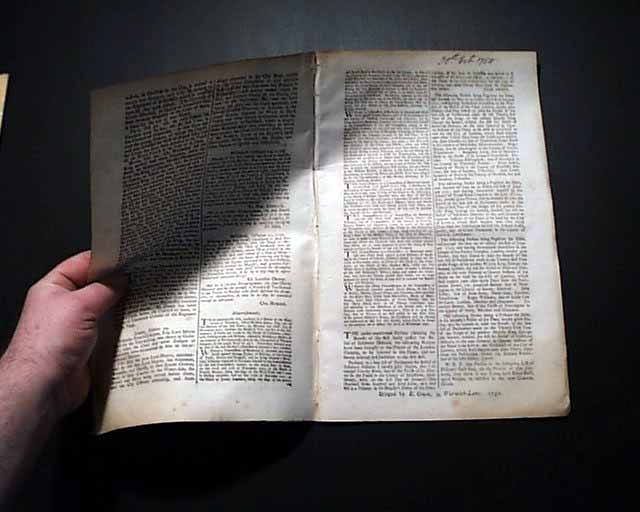 A complete newspaper measuring about 7 by 11 1/2 inches and is in great condition. Made of rag paper which was used back in the day (no wood pulp). Fine and very early newspaper. Can easily be framed. WOULD MAKE A GREAT UNIQUE GIFT.