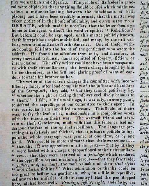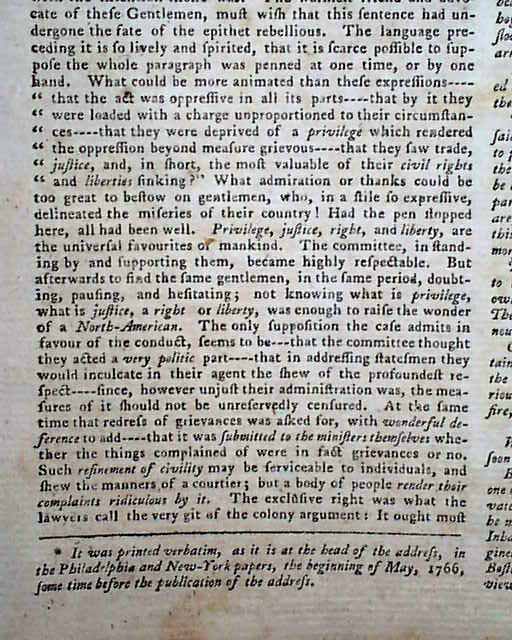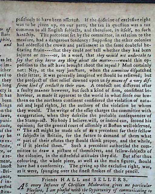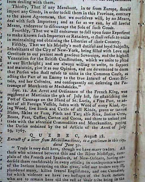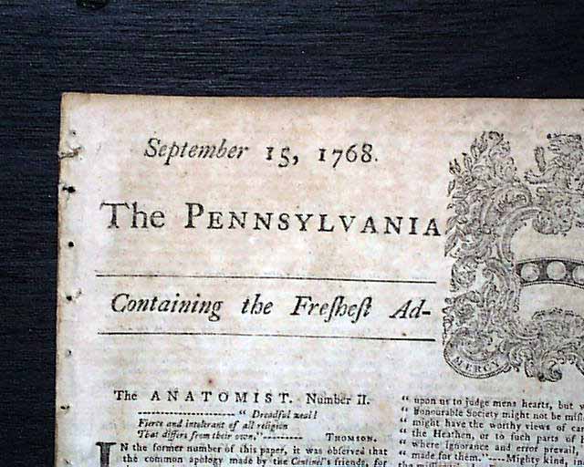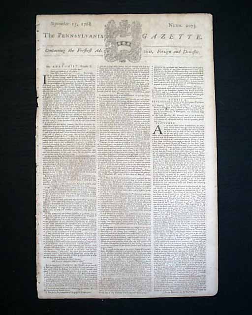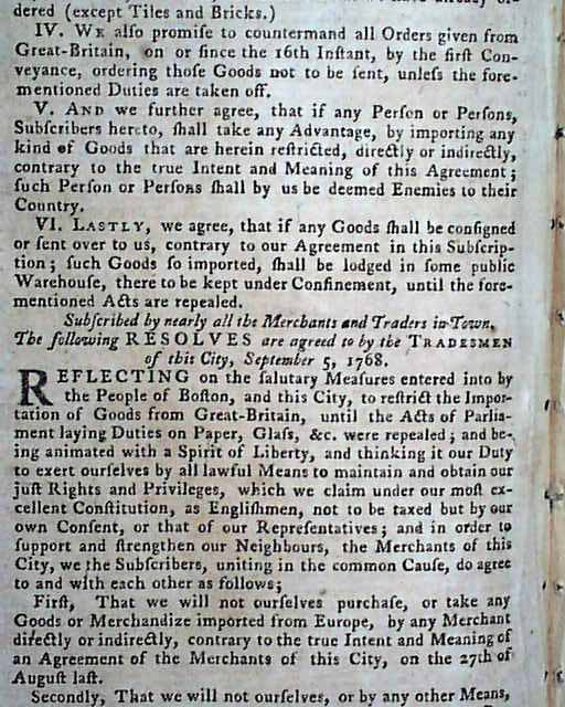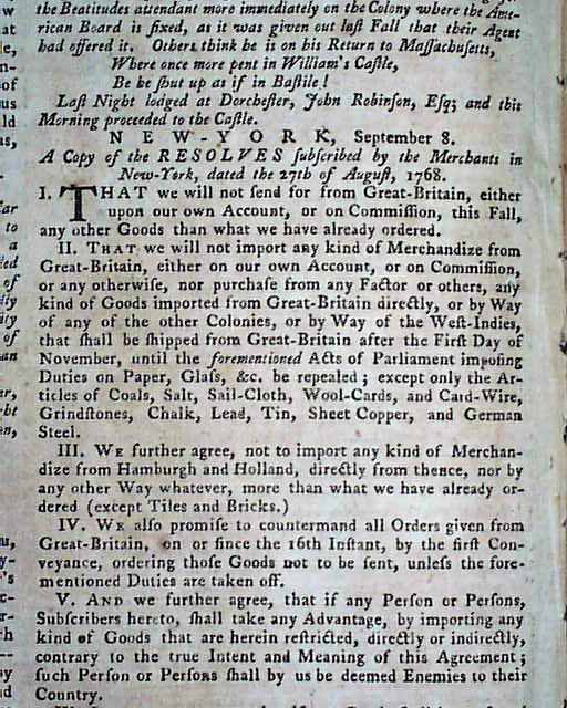 PENNSYLVANIA GAZETTE, Philadelphia, Sept. 15, 1768 Page 2 has a letter taking over a full column, with mention of the Stamp Act plus other tidbits relating to the troubled relations between England & America (see the photos). Page 2 has the list of resolves from New York concerning non-importation, until the Townshend Acts are repealed (quite historic). Also, the Resolve of the New York tradesmen mentions not doing business with merchants who do not support non-importation.