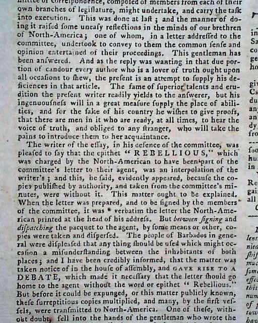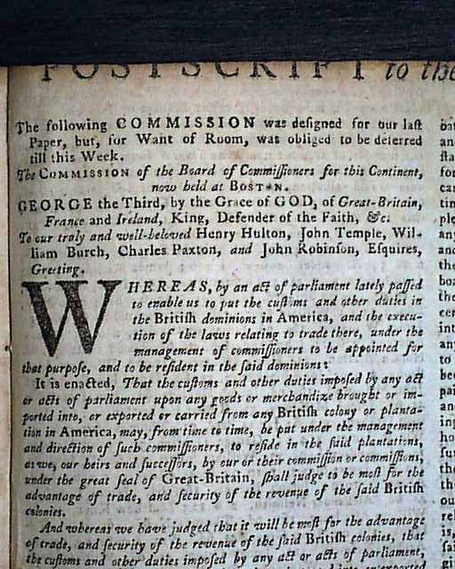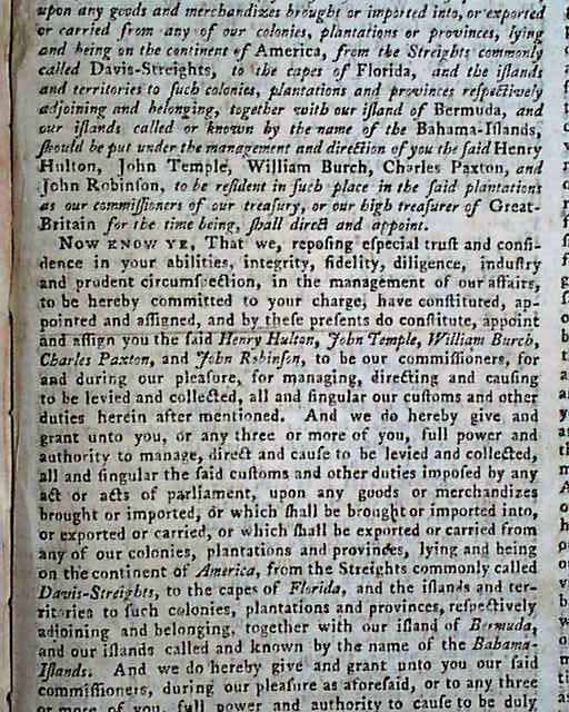 This four page issue also includes the single sheet "Postscript" as well, with most of the ftpg. taken up with a report headed: "Whereas, by an act of parliament lately passed to enable us to put the customs & other duties in the British dominions in America & the execution of the laws relating to trade there..." with more (see photos for the beginning).