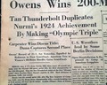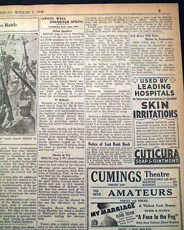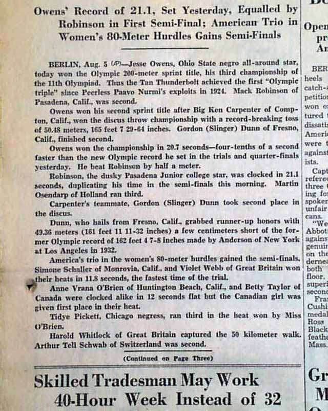 This 12 page newspaper has a nice banner headline on the front page: "Owens Wins 200-Meter Final At Berlin In 20.7" with subheads that include: "Tan Thunderbolt Duplicates Nurmi's 1924 Achievement By Making Olympic Triple"