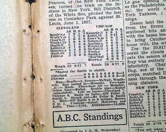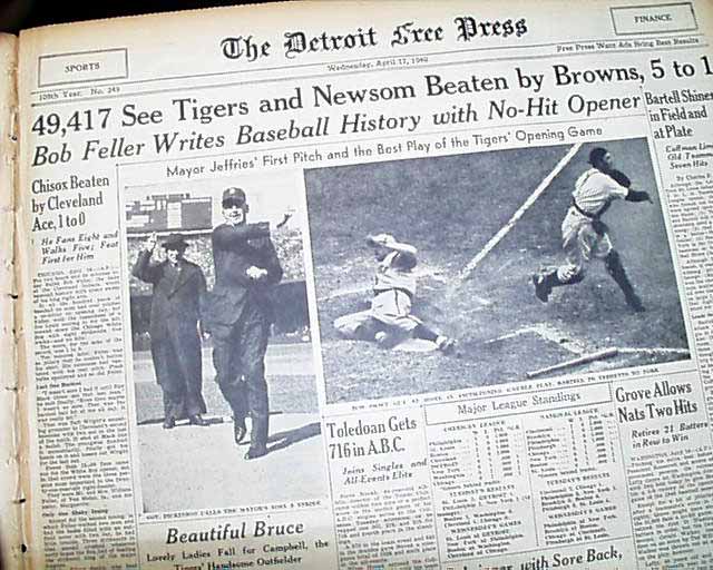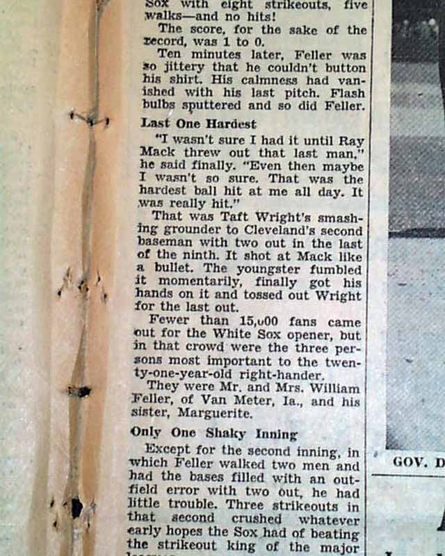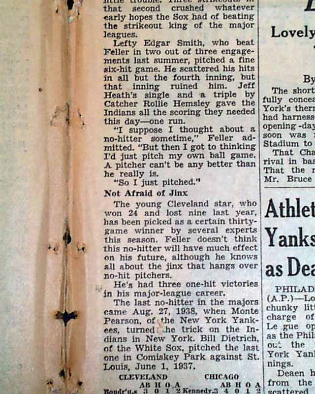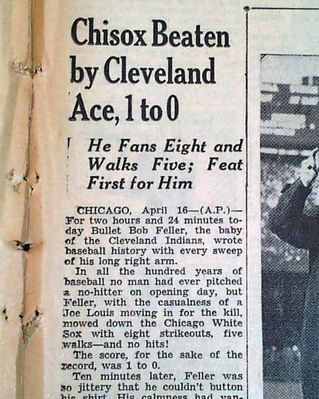 This 34 page newspaper has a nice seven column headline on page 23 (1st page of the sport's section): "Bob Feller Writes Baseball History with No-Hit Opener" with subheads.