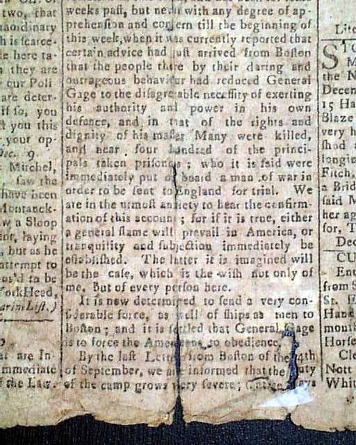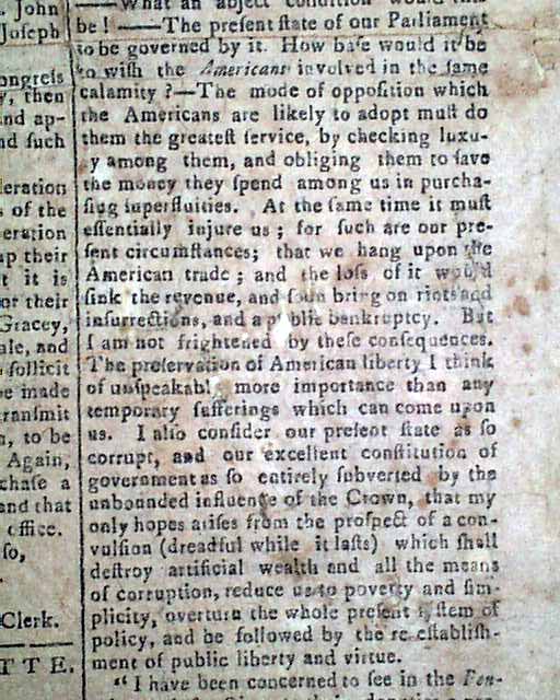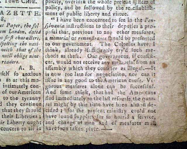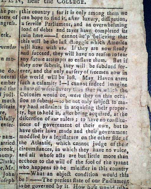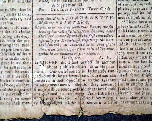 A very rare title from this pre-Revolutionary War era. The front page has results of town meetings at Wallingford and Derby, Connecticut. They are followed by a report from the Boston Gazette which tells of the troubling relationship with England (see), a portion including: