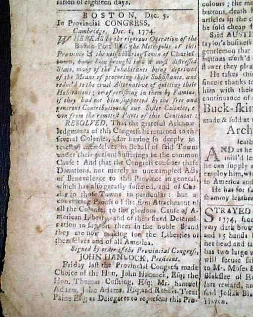 The back page has a document from the Provincial Congress concerning the Boston Port Bill, signed in type by: John Hancock, President (see). Other interesting tidbits relating to the coming Revolutionary War.
