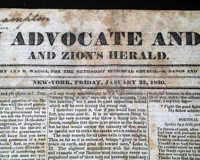 CHRISTIAN ADVOCATE & JOURNAL & ZION'S HERALD, New York, January 22, 1830