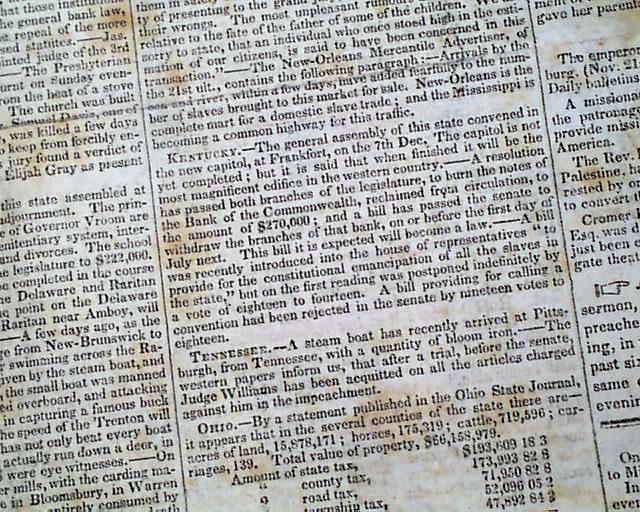 A page 3 report from "Kentucky" says the general assembly "...convened at the new capitol, at Frankfort, on the 7th December. The capitol is not yet completed; but it is said that when finished it will be the most magnificent edifice in the western country."