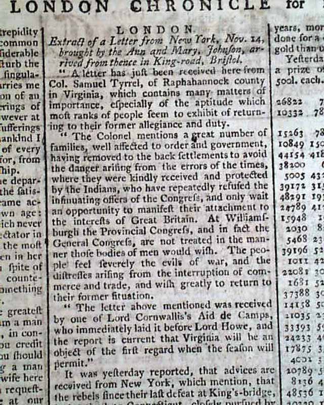 * ...a great number of families...having removed to the back settlements to avoid the danger arising from the errors of the times where they were kindly received & protected by the Indians who have repeatedly refused the insinuating offers of the Congress & only wait an opportunity to manifest their attachment to the interests of Great Britain. At Williamsburgh the Provincial Congress..are not treated in the manner those bodies of men would wish..." and also: "...received by one of Lord Cornwallis's Aid de Camps...that Virginia will be an object of the first regard when the season will permit...the rebels since their last defeat at King's bridge had retired to Connecticut closely pursued by Gen. Howe & that Gen. Washington had sent a message to Gen. Howe for a suspension of arms for three months...