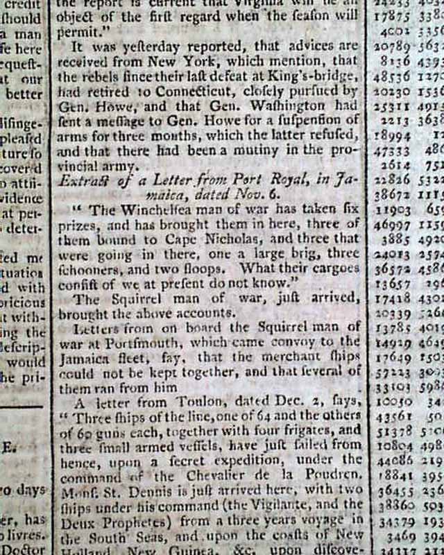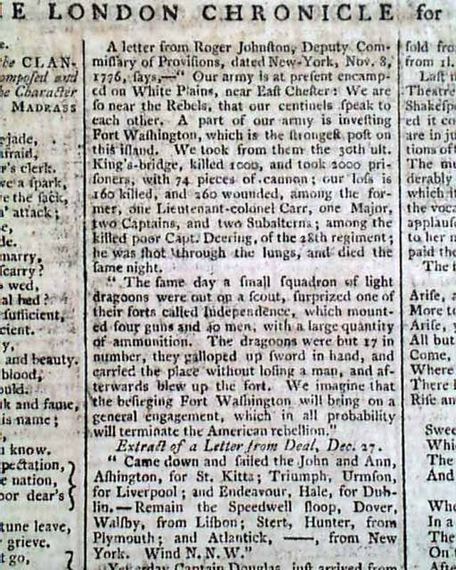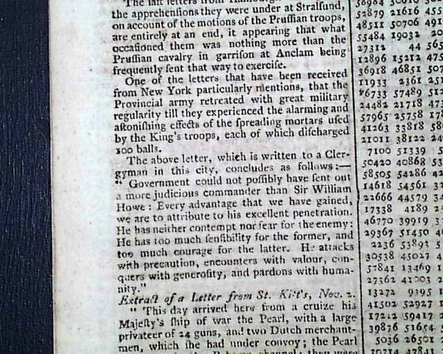 The back page has some nice war reports as well (see photos) including a letter from the camp at Crown Point, and a letter from New York noting: "Our army is at present encamped on White Plains...We are so near the Rebels that our centinels speak to each other. A part of our army is investing Fort Washington...We took from them the 30th ult. King's bridge, killed 1000...surprized one of their forts called Independence...We imagine that the besieging fort Washington will bring on a general engagement which in all probability will terminate the American rebellion."