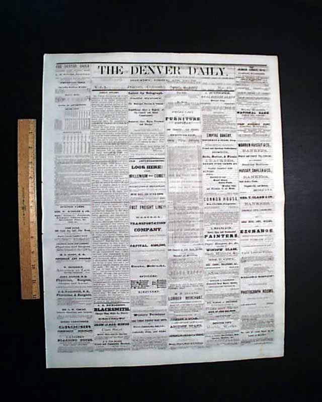 This 4 page newspaper has news of the day with several interesting advertisements. With newspapers West of the Mississippi being very rare prior to 1900, here is an opportunity to get a issue from the old West back when cowboys, Indians, saloons, gold miners & gunfights were often seen on a regular basis. Very early for Colorado.