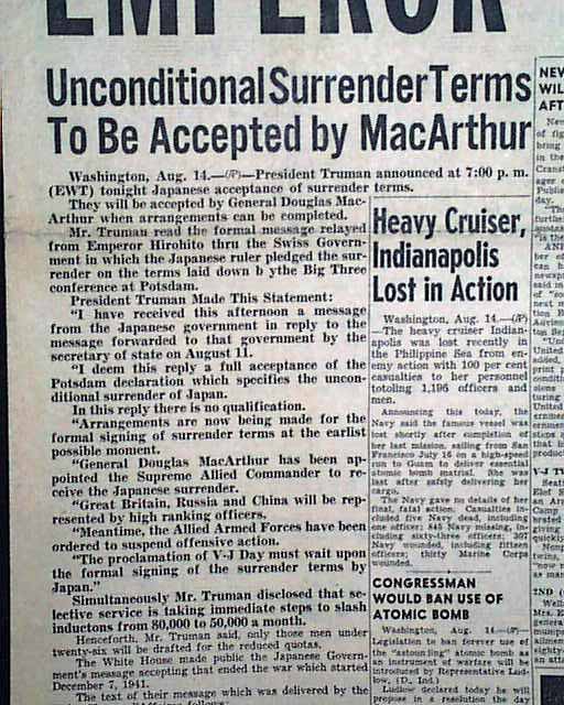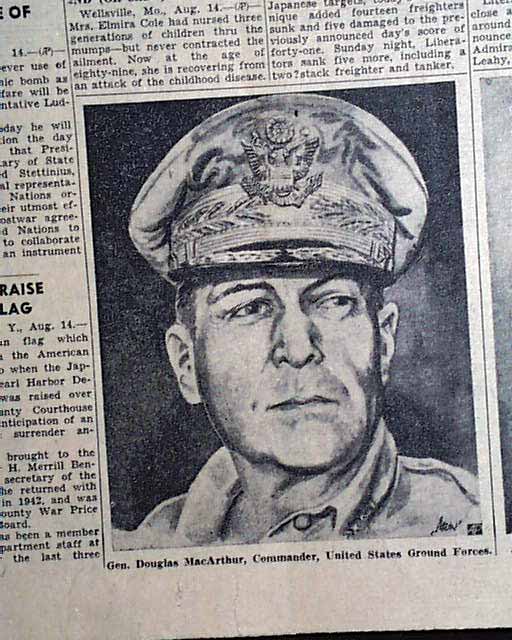 This issue features the bold banner headline "JAPS QUIT! World's Most Terrible War Now Over" Another headline "Emperor Allied Puppet" with subhead "Unconditional Surrender Terms To Be Accepted by MacArthur".  This also features illustrations of Gen. Douglas macArthur, Commoander, United States Ground Forces and Adm. Chester W. Nimitz, Commander in Chief, U.s. Pacific Fleet.