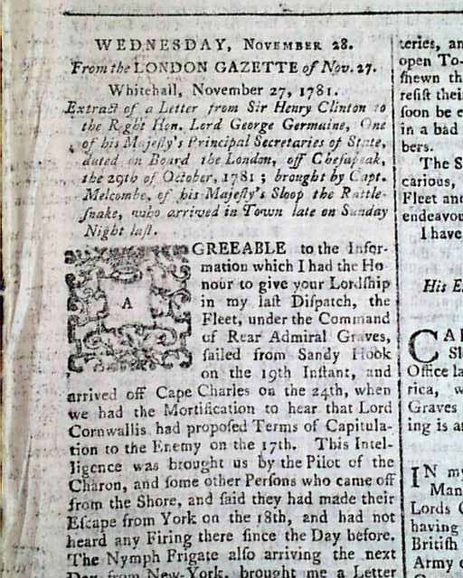 * ...when we had the mortification to hear that Lord Cornwallis had proposed terms of capitulation to the enemy on the 17th. This intelligence was brought us...other persons who came off from the shore & said they had made their escape from York on the 18th...Comparing therefore the intelligence given by these people & several others...we cannot entertain the least doubt of his Lordship's having capitulated & that we are unfortunately too late to relieve him...