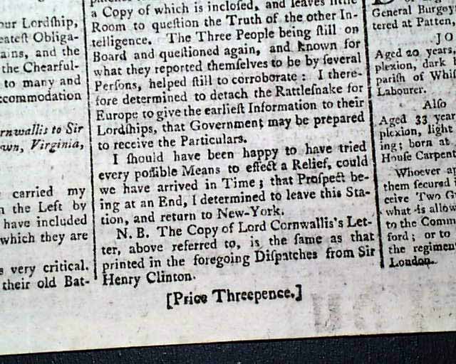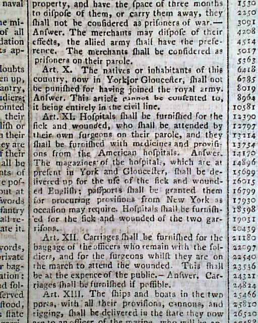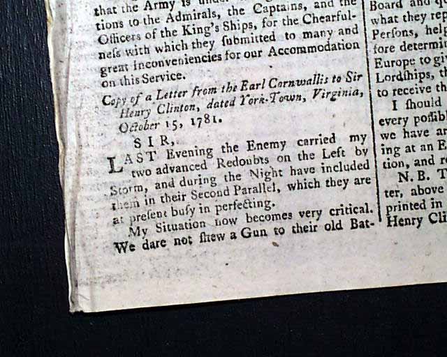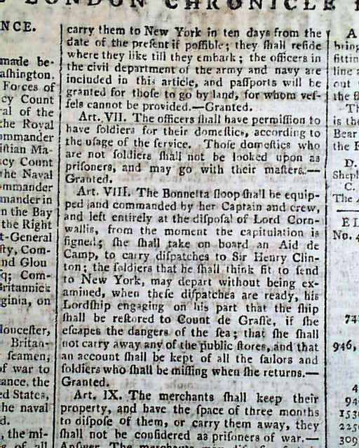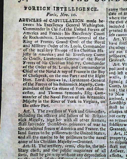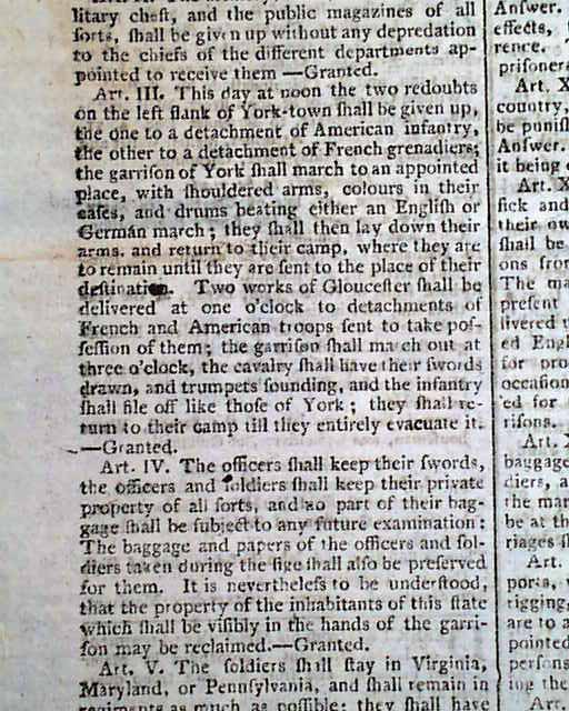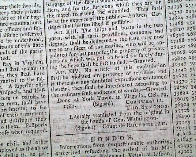 Nearly two-thirds of page 2 is taken up with the complete printing of the: "Articles of Capitulation made between his Excellency General Washington...and the Right Hon. Lord Cornwallis..." including all 14 Articles with the signatures in type of Cornwallis, Tho. Symonds, and Count de Rochambeau (see). Extremely historic!