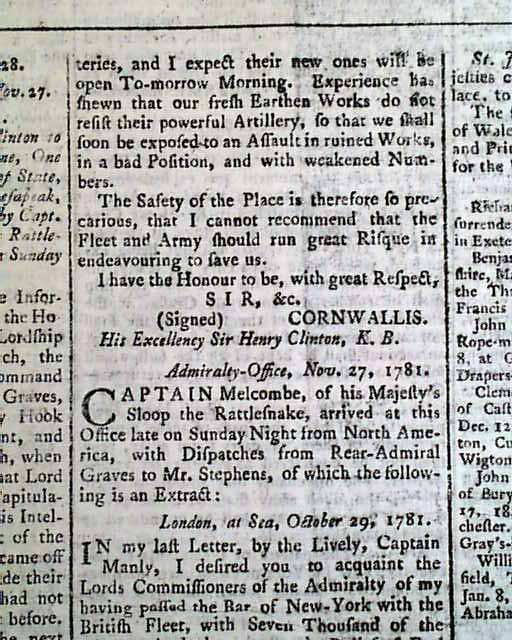 This is a terrifically historic issue, reporting the surrender of Lord Cornwallis and his British army to Washington at Yorktown, Virginia, essentially ending the Revolutionary War.