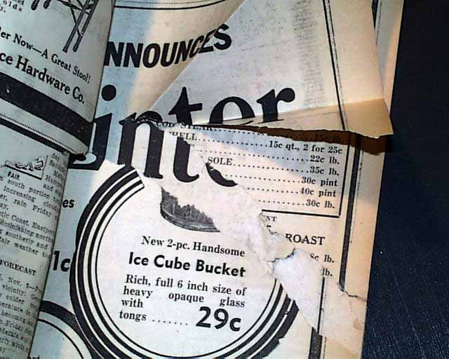 Other news of the day throughout. Some tearing to the right margin near the central fold in all the leafs. Light browning with other minor margin wear, otherwise in good condition.