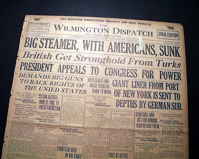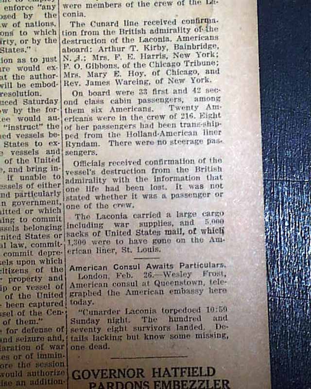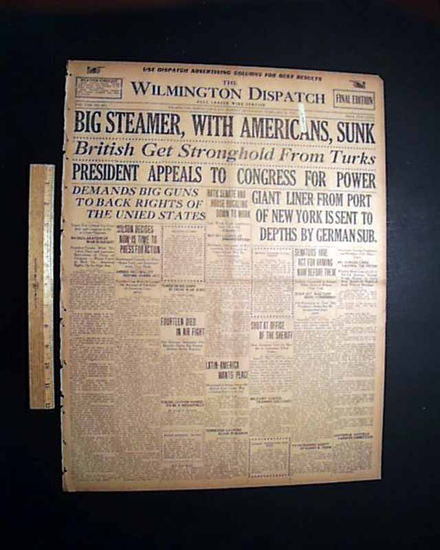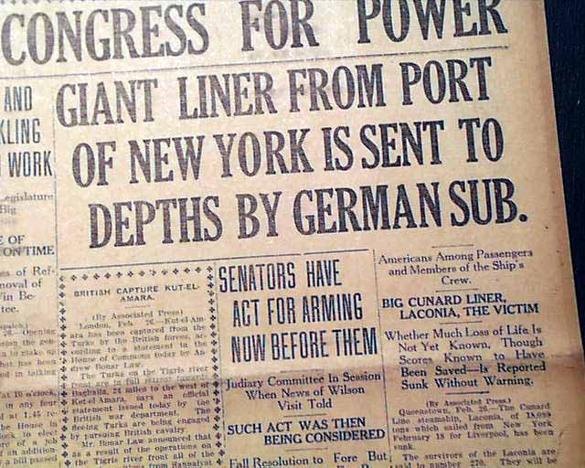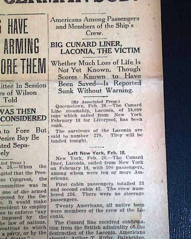 This 8 page newspaper has a nice banner headline on the front page: "BIG STEAMER, WITH AMERICANS, SUNK" with subheads that include: "GIANT LINER FROM PORT OF NEW YORK IS SENT TO DEPTHS BY GERMAN SUB" and more. (see)