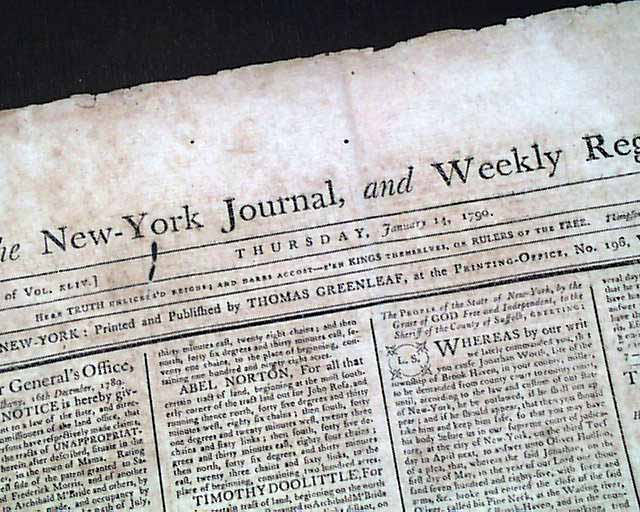 THE NEW YORK JOURNAL, AND WEEKLY REGISTER, from New York, dated January 14, 1790