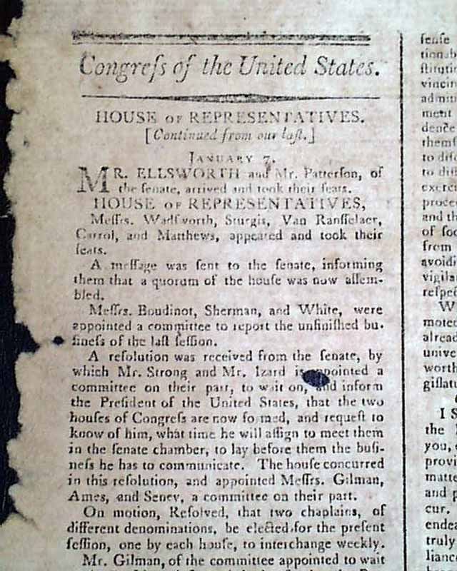 On page 2 issue under "Congress of the United States" is the business of the House of Representatives from "January 7" which includes word that a resolution was received from the Senate stating that a committee was appointed "...to wait on and inform the President...that the two houses of Congress are now formed, and request to know of him, what time he will...meet them in the senate chamber, to lay before the business he has to communicate..."